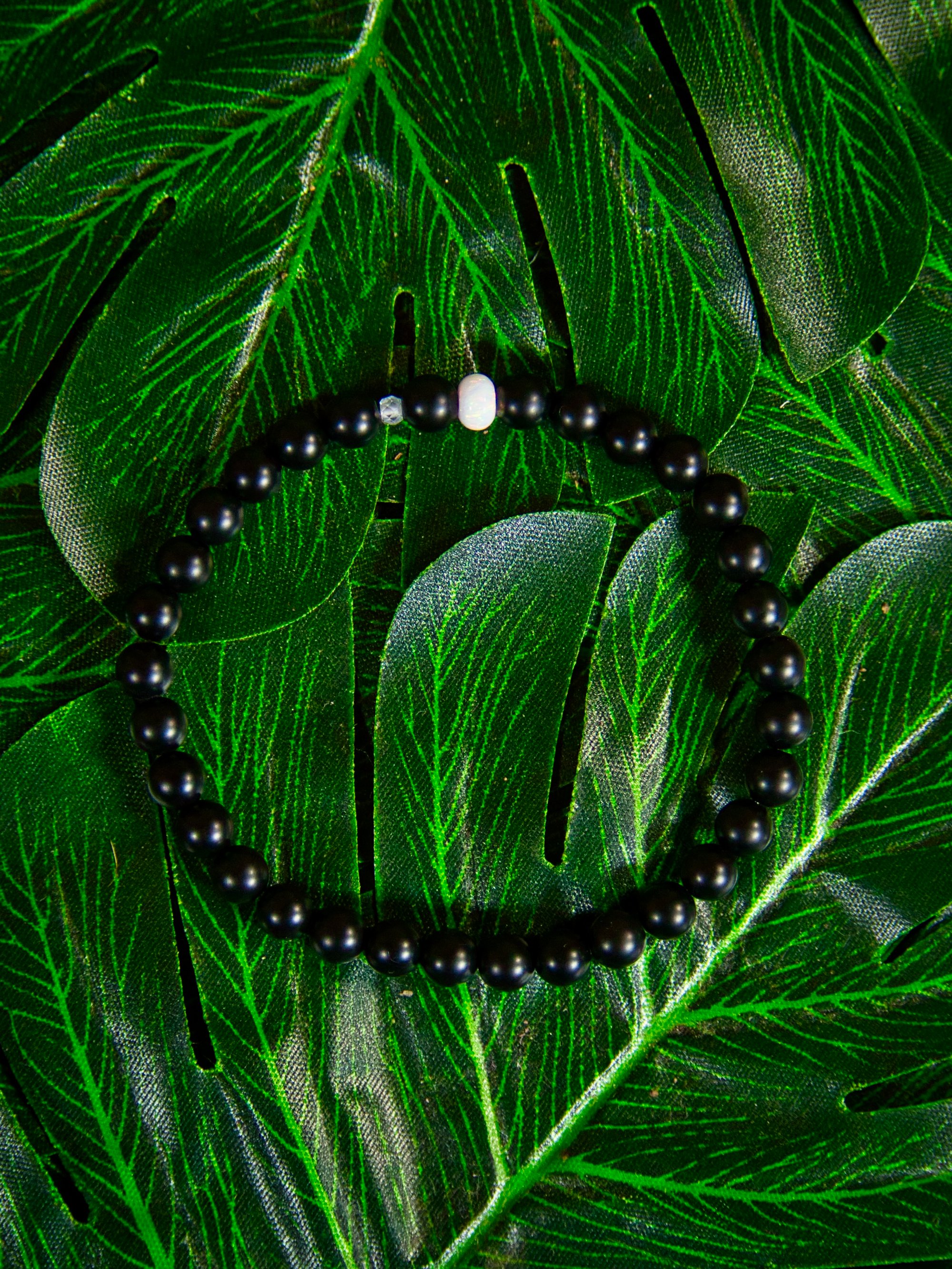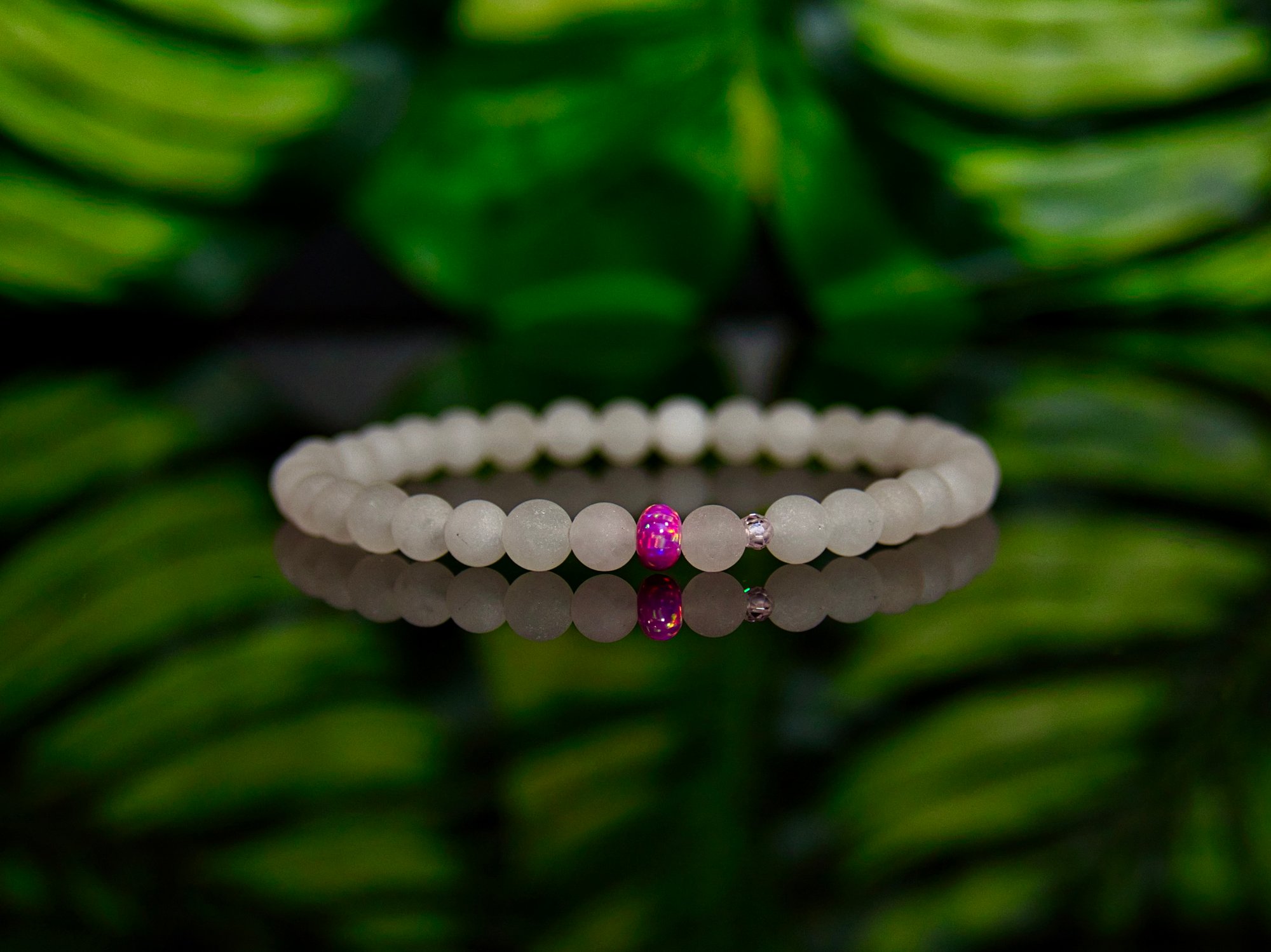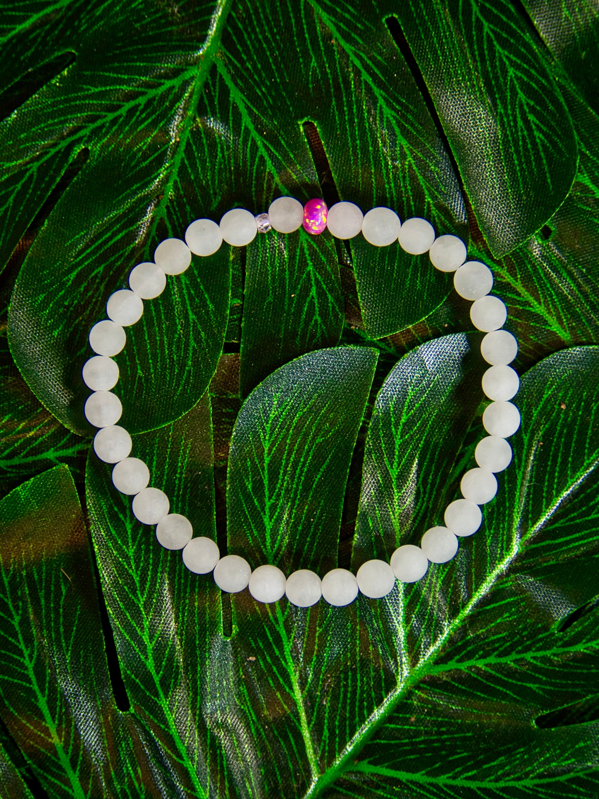 • Artisan Made with smooth round matte onyx and white jade; faceted round cubic zirconia in clear and pink, and smooth rondelle man-made opal in white and pink beads.
