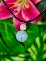 (Alt text for images: A multicolored necklace on a green floral platform on display.)
