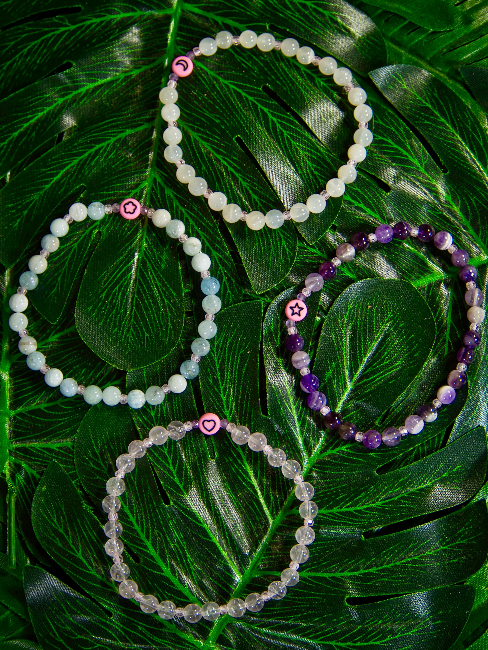 • Artisan Made with faceted rondelle amethyst, faceted rondelle pink cubic zirconia, flat round pink acrylic charm beads, and smooth round gemstones consisting of: aquamarine, amethyst, moonstone, and rose quartz.