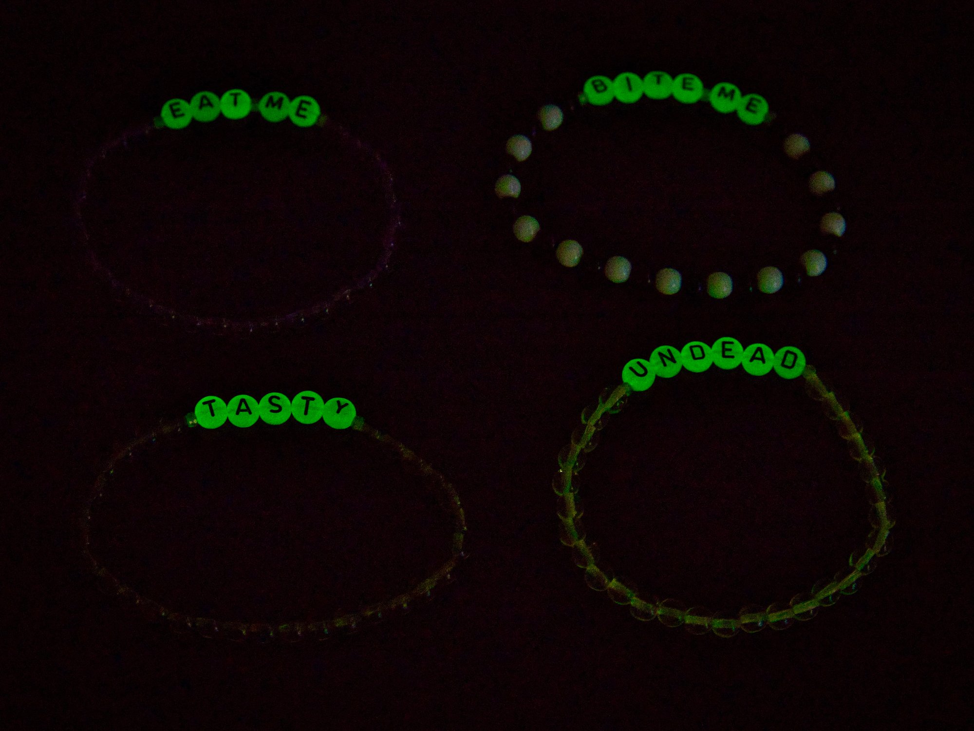 • Artisan Made with smooth round Czech glass druk in various colors (black, white, green, purple, and uranium glass), flat round glow in the dark black acrylic beads, and faceted rondelle cubic zirconia beads.